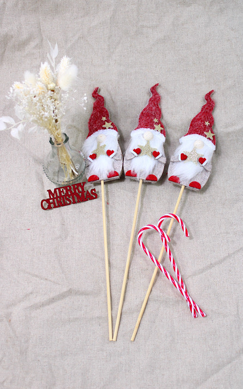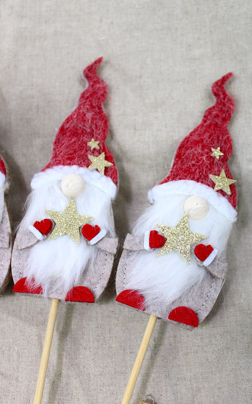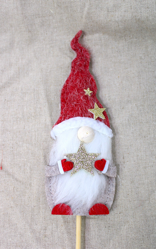 Dieser süße Filz-Wichtel befindet sich an einem Holzstab. Perfekt um Weihnachtssträuße aufzuhübschen, für Blumenkästen oder für schöne DIY Ideen mit Steckschaum.