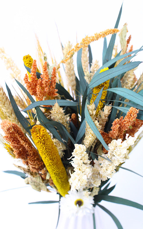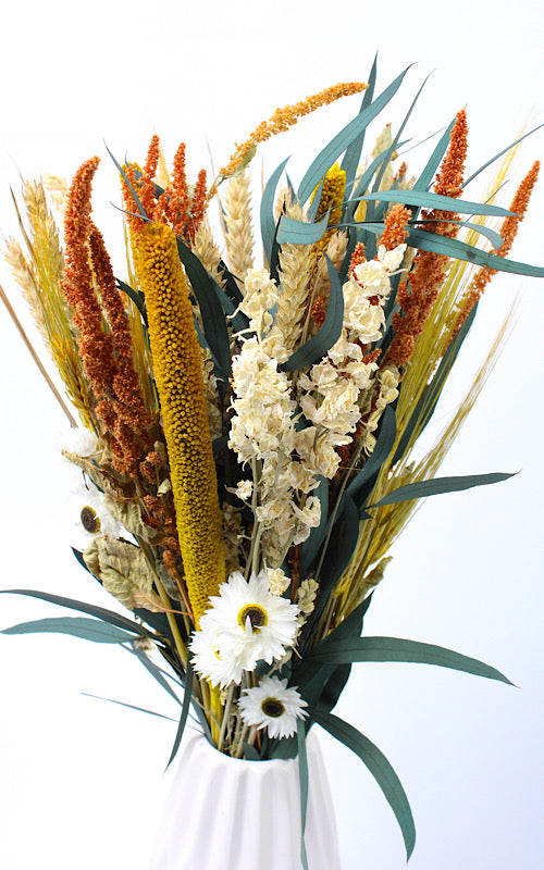 Dieser wunderschöne Trockenblumenstrauß beinhaltet Babala, Weizen, Gerste, Strohblumen, Amaranthus und weitere Trockenblumen. Eine sehr schöne Kombination für jedes gemütliche Zuhause. Der Strauß lässt sich einfach für Vasen auf die gewünschte Länge kürzen. (Strauß wird ohne Vase geliefert).